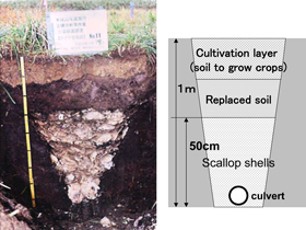 Accordingly, CERI has been conducting routine research at the same place to determine the service life of culverts using scallop shells as the filter material. These shells are produced in large amounts in areas with many scallop farms in northern Hokkaido and the Sea of Okhotsk coast. The results confirmed that the drainage was sufficient and that scallop shells remained intact without dissolving or breaking due to the highly acidic water peculiar to peaty soil, even 11 years after the construction. We are planning to continue the research at the same place in the future to determine the service life of scallop shells as a filter material for culverts, and develop technical guidelines for rational renewal of such culverts.