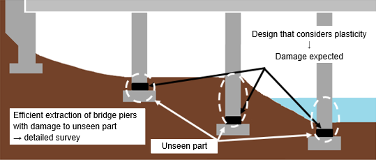 However, bridge pier bases?where damage is highly likely?are often located in soil sections or underwater, making rapid visual inspection difficult. For such assessments, therefore, we focused on Bayesian anomaly detection methods. These methods detect state changes using features derived from parameters such as dominant frequencies, vibration modes, and damping during structural vibration. This probabilistic approach has already demonstrated results in damage detection for signposts1) and PC girders2).