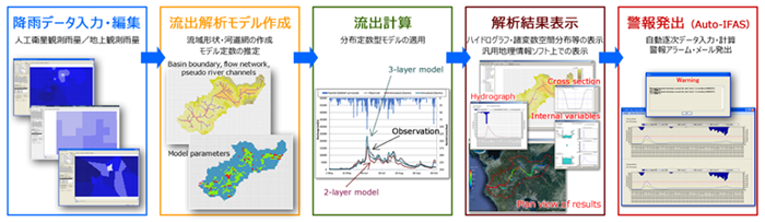 IFAS (Integrated Flood Analysis System) は、インターネットを通じ無償で入手可能で、ほぼ全世界をカバーしている地形や土地利用のグローバルデータを用いて、簡単に流出解析モデルが構築できるシステムです。IFASだけで、データの入手、モデルの構築、降雨流出解析、結果表示などの流出解析に必要な一連の作業を行うことができます。