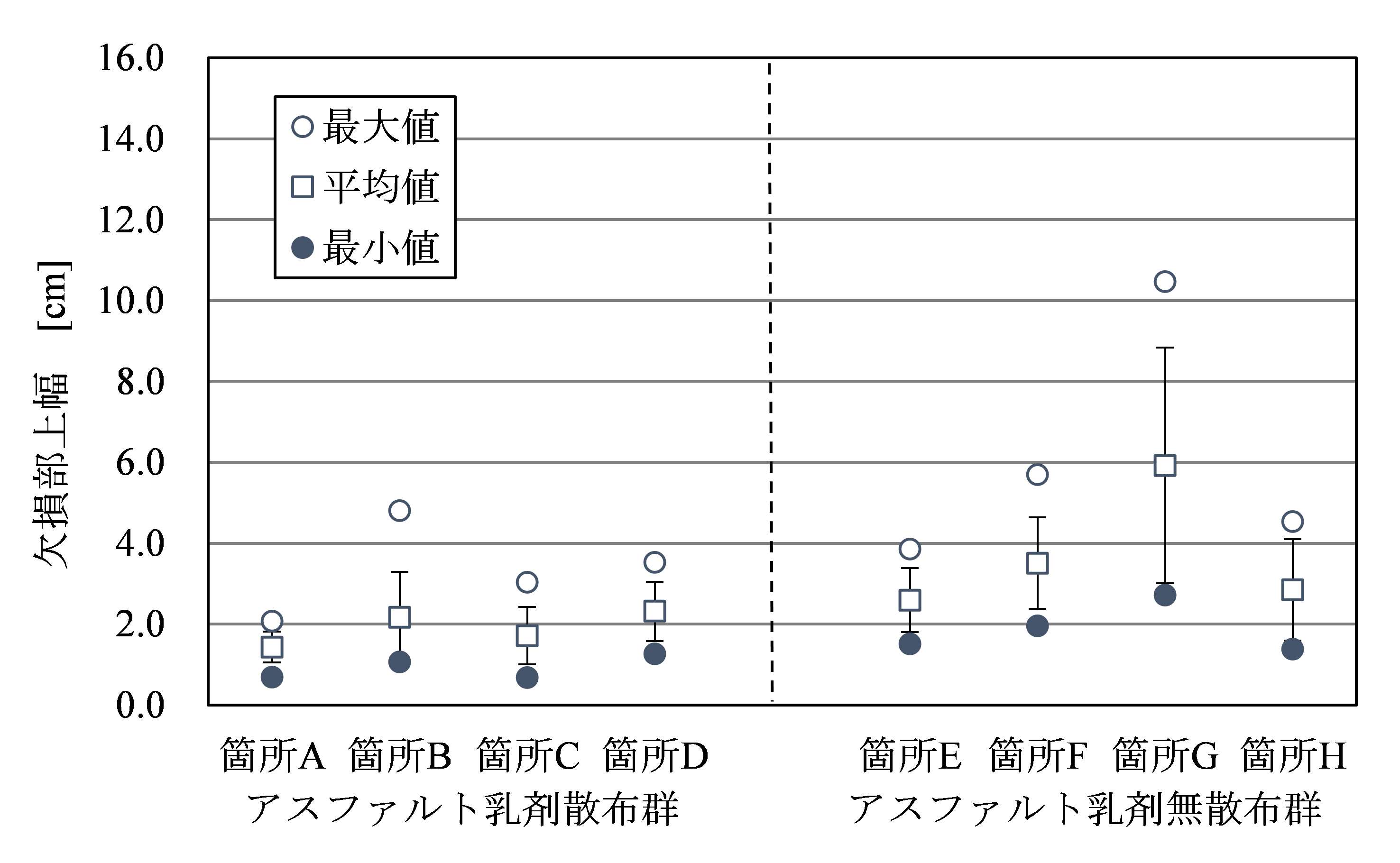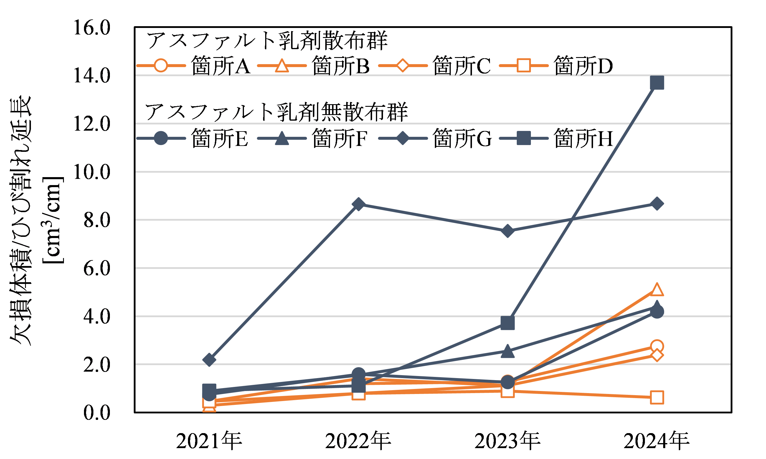 そして、構築したモデルからひび割れ欠損部の上部の幅や、欠損部の体積等を計測しました。計測結果より、アスファルト乳剤を散布した箇所の欠損量は散布していない箇所よりも小さいこと(図-3)や、経年的に欠損量を抑制できていること(図-4)を把握できました。
