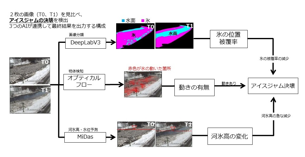 このモデルは、CCTVカメラ画像をAIによる画像解析によってアイスジャムを自動的に検知し、アラート配信を行うものとなっており、「画像分類」「物体検知」「河氷高・水位予測」を行うAIモデルで構成されています。「画像分類」は2枚の画像から画像全体に占める河氷面積の割合の変化を抽出し、「物体検知」は河氷の流下などの動きの有無を判定します。「河氷高・水位予測」はアイスジャム発生時の河氷高と水位の変化を抽出し、これら3つのモデルの判定結果を基に総合的にアイスジャム発生を判定するようになっています(図1)。なお、モデルの学習に使用したデータは、50枚のアイスジャムの実画像と400枚以上の画像生成AIで作成した生成画像を用いています。