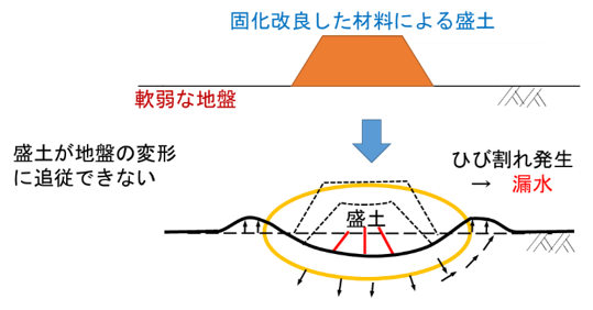固化土の盛土材料としての使用は昔から行われていましたが、不良土を施工できるまでに含水比(土の重さに対する間隙水の重さ)を下げるには固化材が大量に必要になり不経済になり得ること、またその結果、時間の経過とともに過剰に固くなり、基礎地盤が軟弱な場合には圧密沈下の変形に追従できず盛土にひび割れが発生してしまい、堤防としての機能を満足しないことがある(図-2)、などの問題がありました。固化破砕土はこれらの問題を解決する一つの技術となります。
