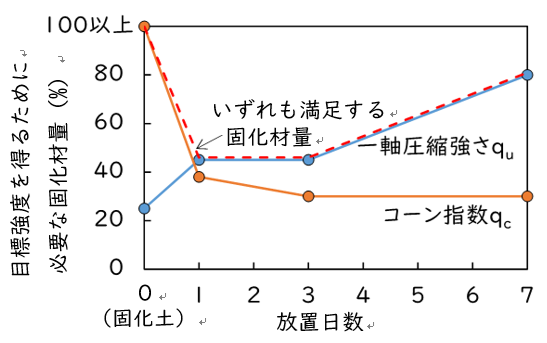 北海道に分布する泥炭(含水比が600%程度の不良土)を固化破砕土として利用することが可能かどうか、固化土と固化破砕土では必要な固化材量はどれくらい違うのか、寒地地盤チームで試験を行いました。そこではこの泥炭の固化改良の強度目標を、普通ブルドーザが走行できるコーン指数(先端が尖った棒を押し込むのに必要な力)で500kN/m2、盛土の安定性を確保できる強度として7日養生後の一軸圧縮強さ(円柱の土を上から押して壊れるときの力)で150kN/m2と設定し、結果として図-3を得ました。固化土の場合、目標のコーン指数を得る固化材量は100%以上、目標の一軸圧縮強さを得る固化材量は22%以上でした。よって両方を満足するために必要な固化材量は100%以上ということになります。一方、例えば放置日数1日で破砕して作製した固化破砕土の場合、目標のコーン指数を得る固化材量は38%以上、目標の一軸圧縮強さを得る固化材量は45%以上でした。よって両方を満足するために必要な固化材量は45%以上ということになります。固化破砕土とすることで固化土の半分以下の固化材量で済むことになります。