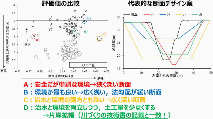 - 各評価値のバランスのとれたデザインとこれまでの川づくりの知見の一致を確認