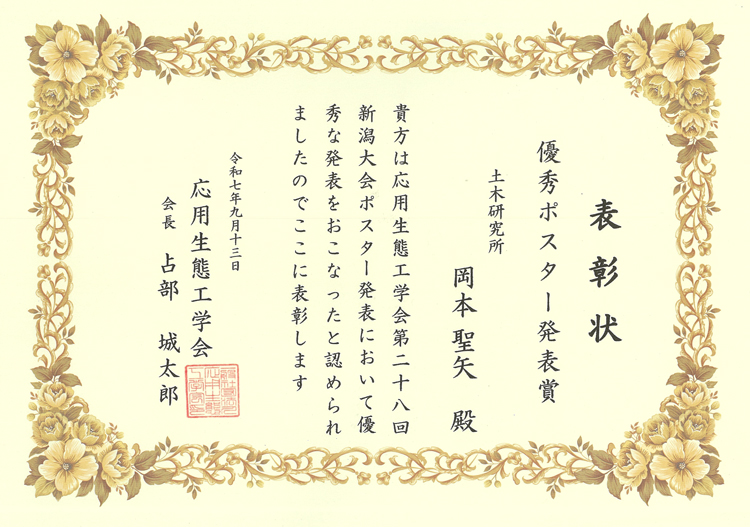 受 賞 名: | 「応用生態工学会第28回新潟大会 優秀ポスター発表賞」受賞 |