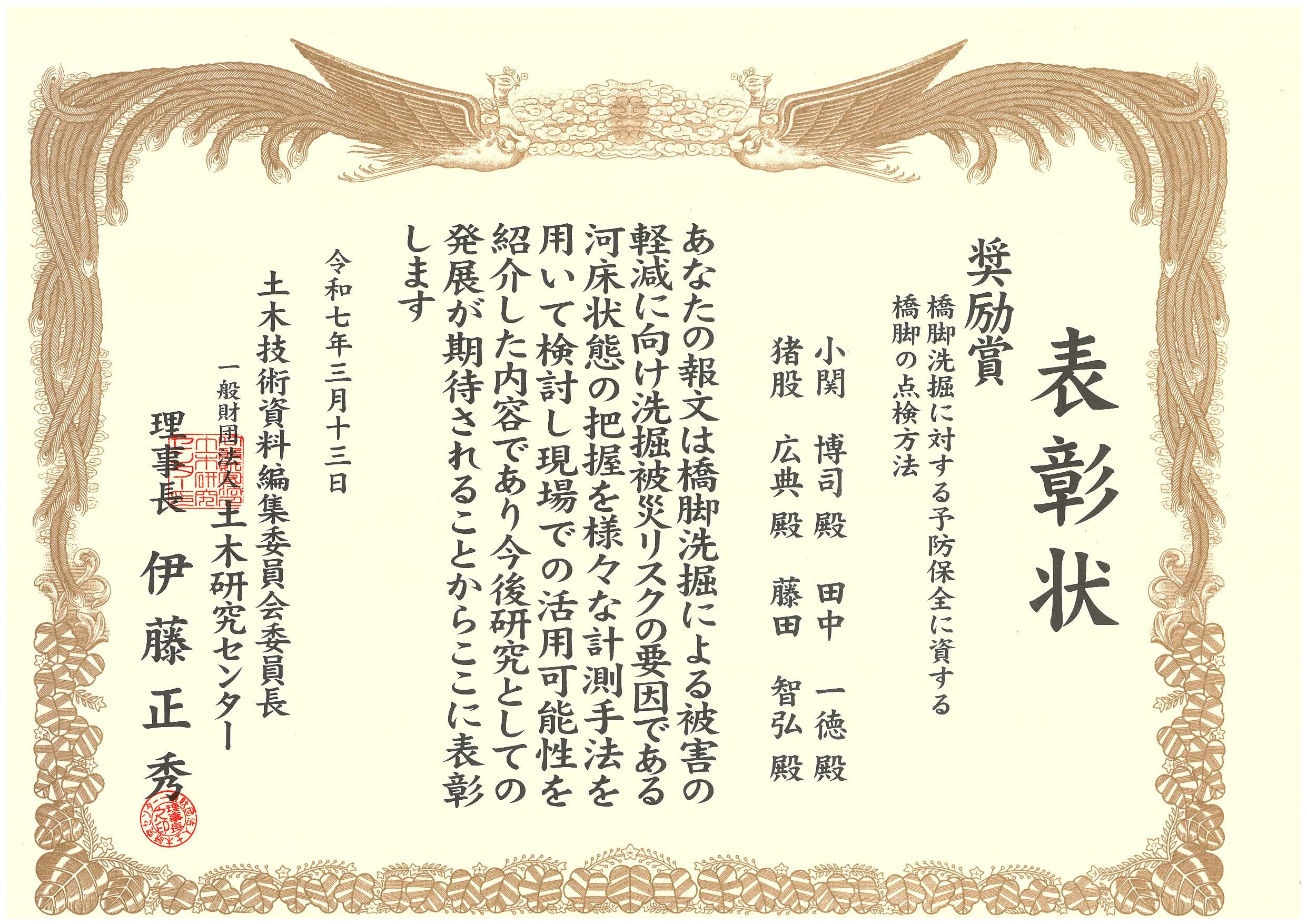 小関博司、田中一徳、猪股広典、藤田智弘:土木技術資料奨励賞、2025年3月13日 賞状