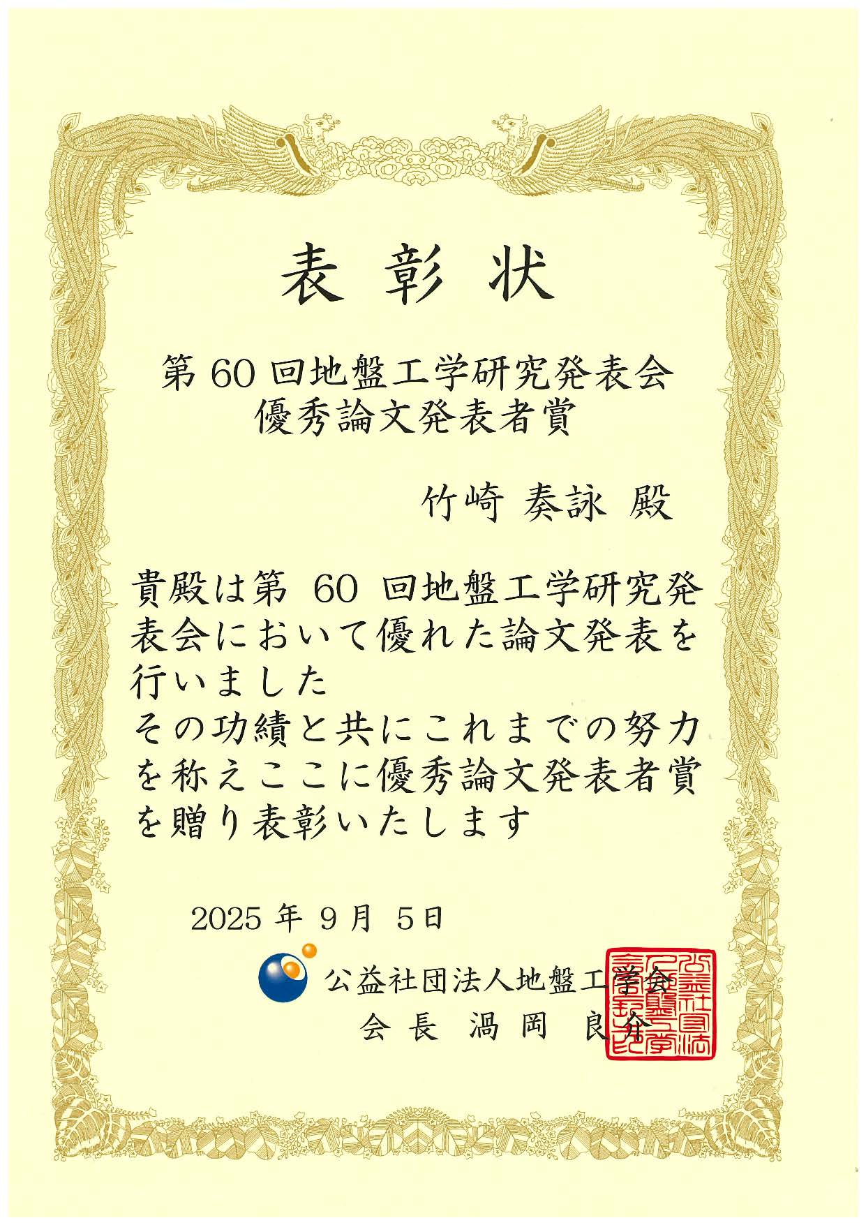 竹崎奏詠:第60回地盤工学研究発表会優秀論文発表者賞、2025年9月5日 賞状