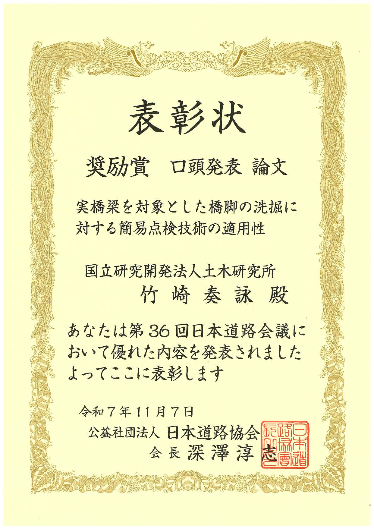 竹崎奏詠:第36回日本道路会議奨励賞口頭発表論文、2025年11月7日 賞状